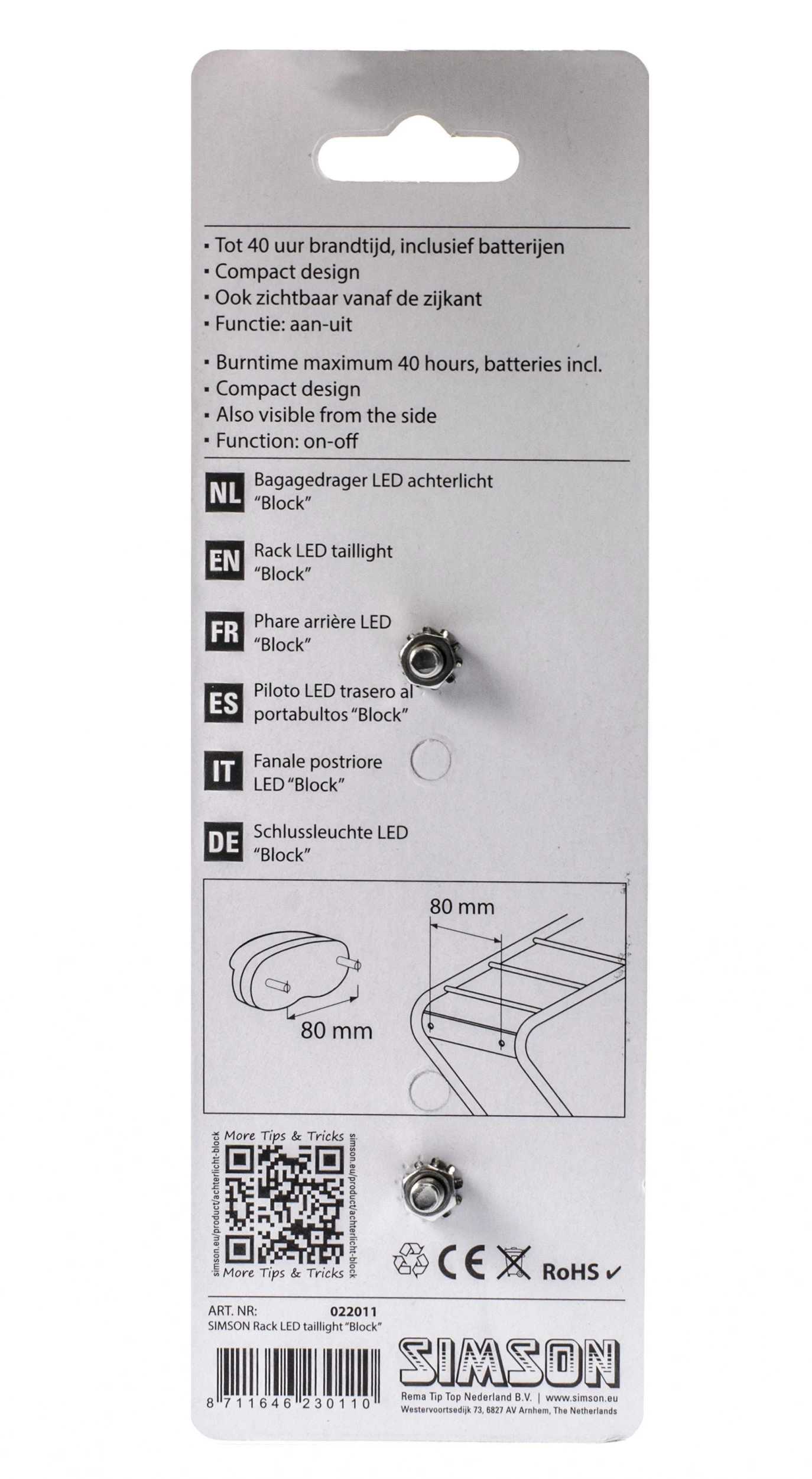 The rear Simson Blocklight is a high quality rear light, specially designed for city, trekking and hybrid bikes. The rear light has a compact design and a powerful red LED for clear light emission for optimum visibility, also on the side. The rear light has a burn time of up to 40 hours! The light is 100% splash and rainproof for an optimal lifetime