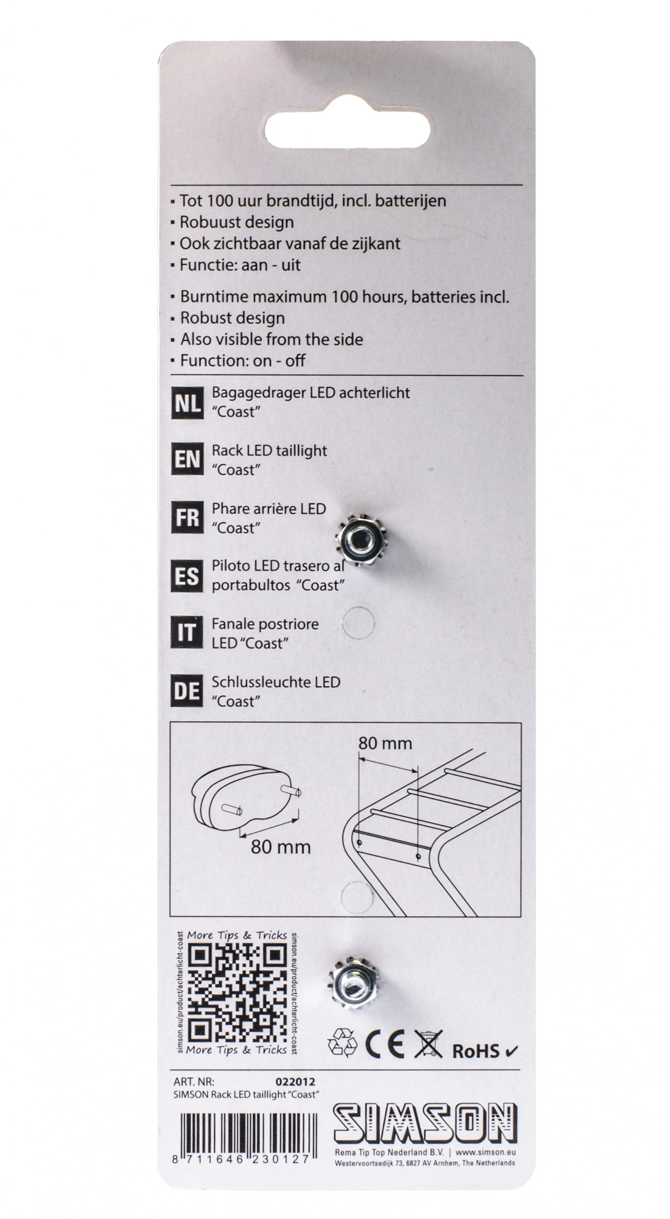 The rear Simson Coastlight is a premium quality rear light. The very economical red LED has a burn time of up to 100 hours! The robust rear light with integrated reflector provides good visibility even on the sides of the bike. The light is splash and rainproof and has 80 mm mounting points