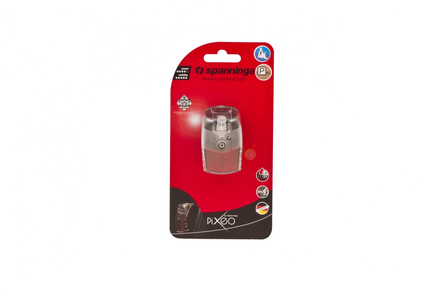 This taillight of spanninginga works on the alternator and has one super bright LED. The taillight gives a constant red light and you are visible up to 500 meters. It can take a beating and is splashproof
