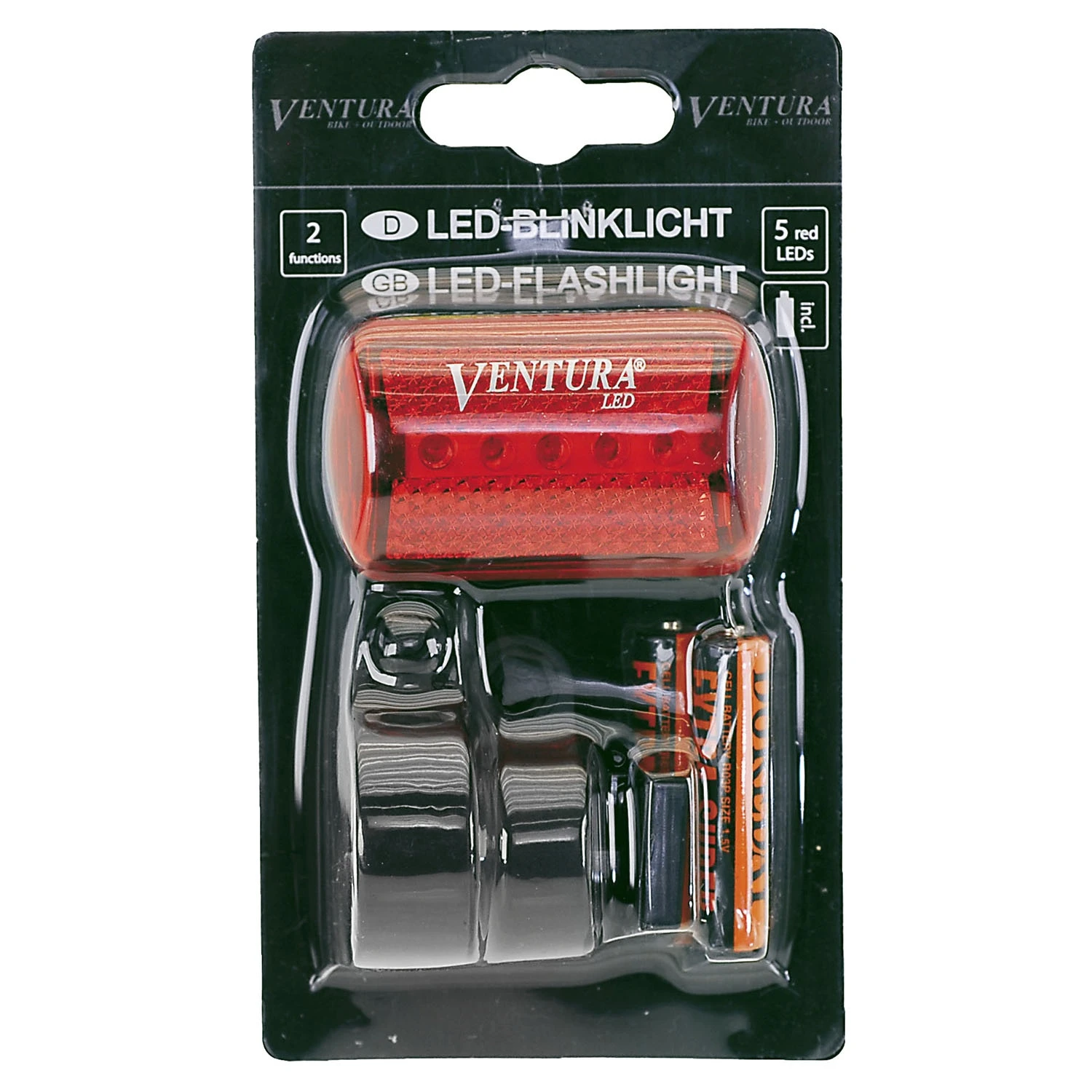 VENTURA-taillight, red, 5 LED, 2 functions, with 2 brackets (seatpost + chainstay), in VENTURA-box , with batteries